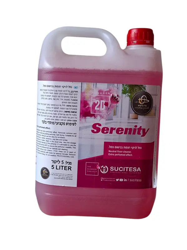 נוזל לניקוי רצפות על בסיס אלכוהול בבישום כפול בניחוח סרניטי (ורדים)נעים, אינו משאיר סימנים , מתייבש מהר ומנקה ביעילות 5 ליטר מחיר ל 100 מ"ל 2.4 ש"ח.